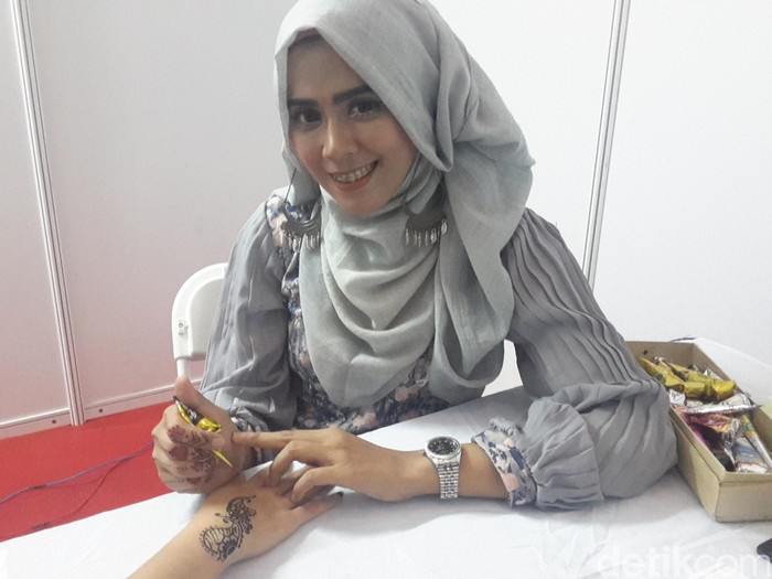 Saat di ruang penjurian, hijabers cantik ini menunjukkan aksi melukis tangan salah satu juri internal. Ia mengeluarkan seperangkat henna dengan berbagai warna mulai dari cokelat, hitam, merah dan biru.