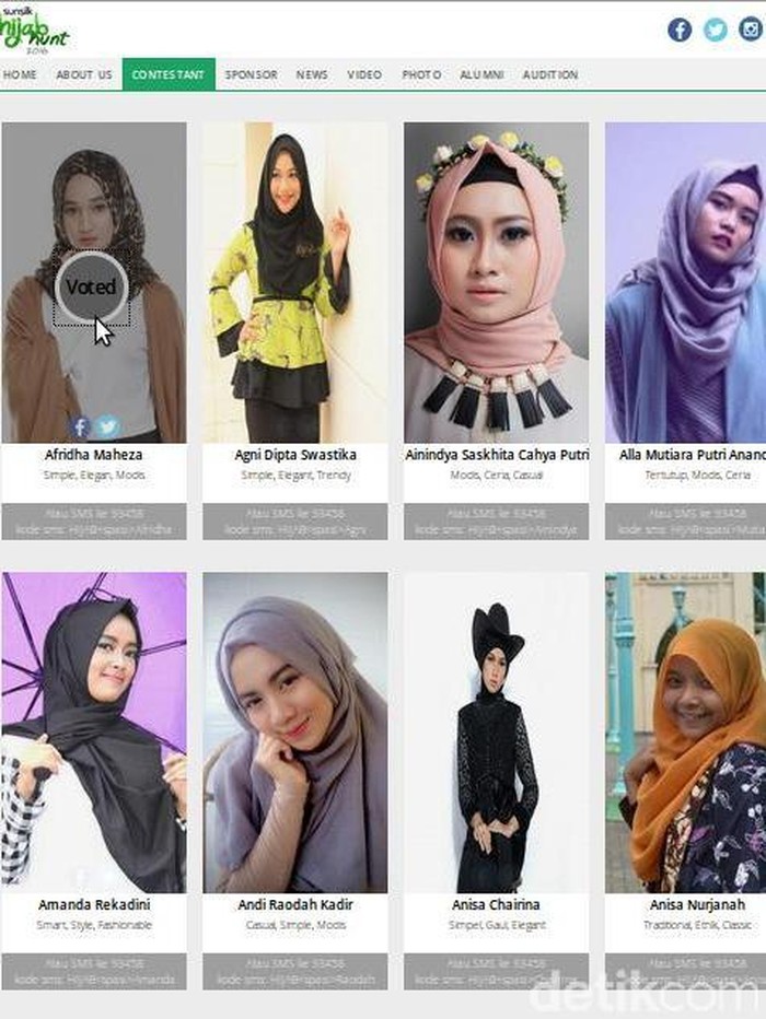 Ya, babak voting online dan SMS hanya berlangsung selama kurang lebih satu minggu sejak dibuka hari ini. Sementara untuk voting melalui SMS caranya sangat mudah, ketik HIJAB [spasi] nama peserta (disesuaikan dengan yang telah ditentukan dari tim Detikcom; ada di bawah foto peserta), kirim ke nomor 93458. Satu kali SMS memakan biaya Rp 2.200.