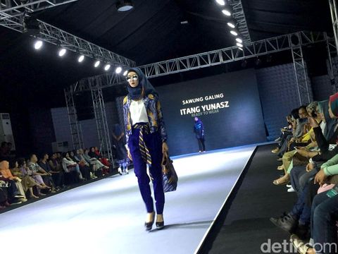 Mengusung tajuk 'Sawung Galing', Itang mengekspresikan desainnya lewat busana clean cut dan simpel. Misalnya saja setelan celana lurus dan blouse yang dimaksimalkan dengan oversized outerwear. Hadir pula maxi dress, kaftan, serta rok panjang yang menonjolkan sisi feminin seorang muslimah.