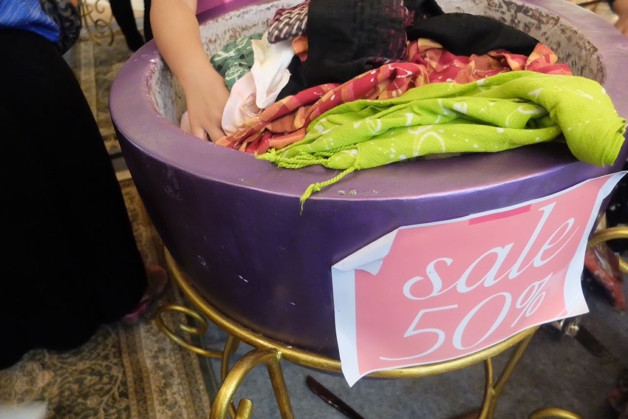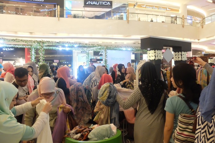 Koleksi yang cukup banyak diminati adalah kerudung serta selendang yang ditempatkan di wadah-wadah khusus. Semuanya didiskon setengah harga. Kerudung bergradasi pelangi dari Rp 95 ribu menjadi Rp 45 ribuan. Sementara selendang tartan jumputan dari Rp 70 ribu turun harga menjadi Rp 35 ribuan.