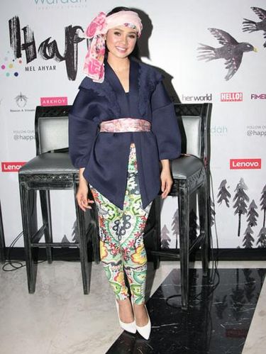Celana bercorak akan terlihat unik dan ekletik ketika dipadukan dengan atasan polos seperti yang dikenakan Andien ini. Ia mengenakan atasan berwarna biru donker dengan bordiran di bagian bahunya. Untuk membuat gaya terlihat lebih stylish lagi, cobalah lilitkan pashmina di kepala yang berfungsi sebagai headband.