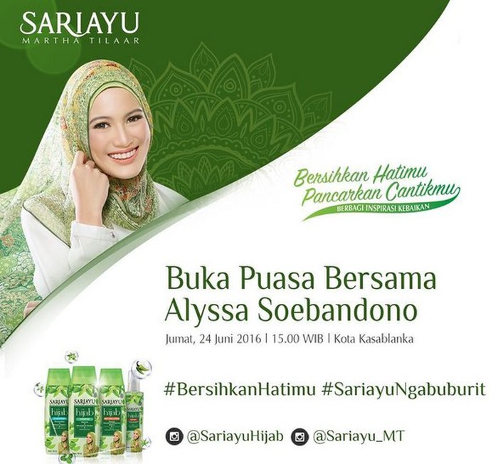 Tak hanya itu saja, ada pula aktris Alyssa Soebandono yang akan datang meramaikan acara. Istri dari Dude Herlino itu akan berbincang-bincang seputar hijab dan mengajak para konsumen setia Sariayu untuk berbuka puasa bersama dengan cara mengikuti kuis yang diselenggarakan di Instagram @sariayuhijab.