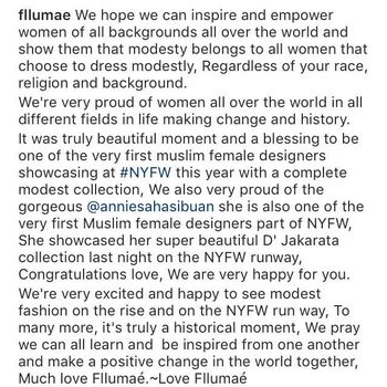 Beberapa akun Instagram lainnya menyebutkan bahwa Anniesa merupakan desainer hijab pertama yang tampil di NYFW. Salah satunya clothing online Flummae yang menuturkan kalau Anniesa merupakan satu-satunya desainer yang berhasil mencetak sejarah di NYFW 2017.