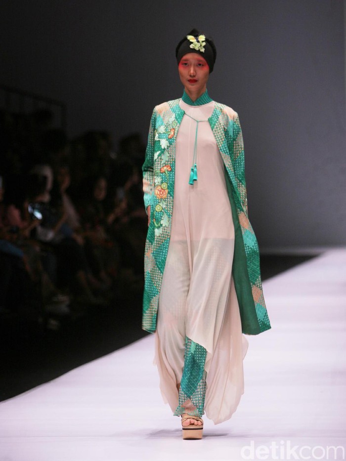 Meski banyak mengeksplorasi budaya lokal, sebanyak 36 tampilan pun dihadirkan dengan detail-detail yang tren saat ini, seperti ruffles, lipit, hingga tassel. Aksen itu diterapkan pada berbagai variasi busana, seperti dress berpotongan flare, tunik, celana panjang, kulot, rok panjang, outerwear, hingga boxy jacket. Itang pun menggunakan material, seperti satin, chiffon, dan twill buches.