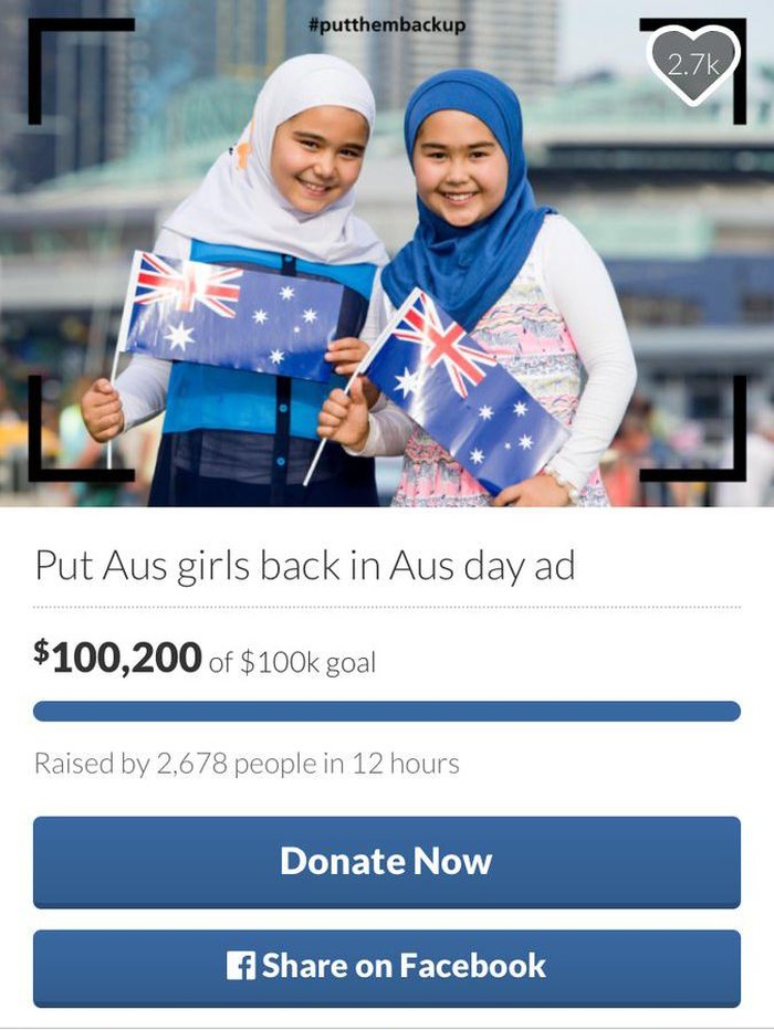 Melalui GoFundMe, pengumpulan dana dilakukan dengan tujuan menampilkan kembali iklan billboard dengan ikon dua gadis muslim berhijab sambil memegang bendera Australia. Tak disangka, dana yang didapat mencapai 125 ribu AUD atau sekitar Rp 1,2 Miliar dalam waktu 24 jam.
