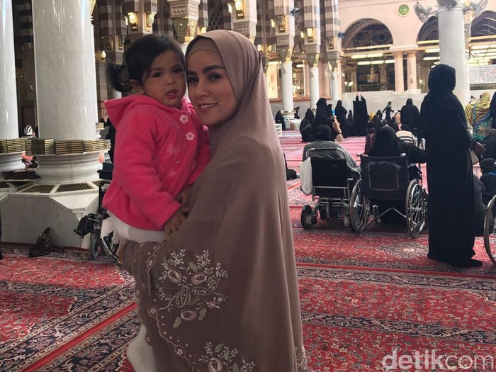 Kali ini Olla berpakaian syar'i menggunakan khimar merah muda dan maxi dress bernuansa biru terang. Material satin silk membuat penampilannya terlihat cerah saat diterapkan di siang hari. Khimar merah muda sengaja dipilih agar busana serasi seperti putrinya yang juga mengenakan setelan baju didominasi merah muda. Olla sangat menikmati suasana di Tanah Suci. Momen ini diambil ketika ia sedang berada di depan pintu utama Masjid Nabawi, Madinah, Arab Saudi. (aln/kik)
