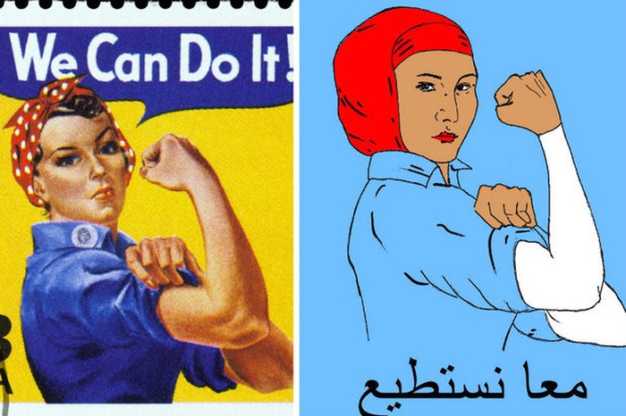 Tidak hanya mengenakan jilbab, siswi muslim yang diketahui bernama Malak Afaneh tersebut juga menambahkan manset putih agar bagian lengan tertutupi tidak seperti grafis aslinya. Meski tidak sama persis namun gambar itu mewakili Rosie The Riveter.