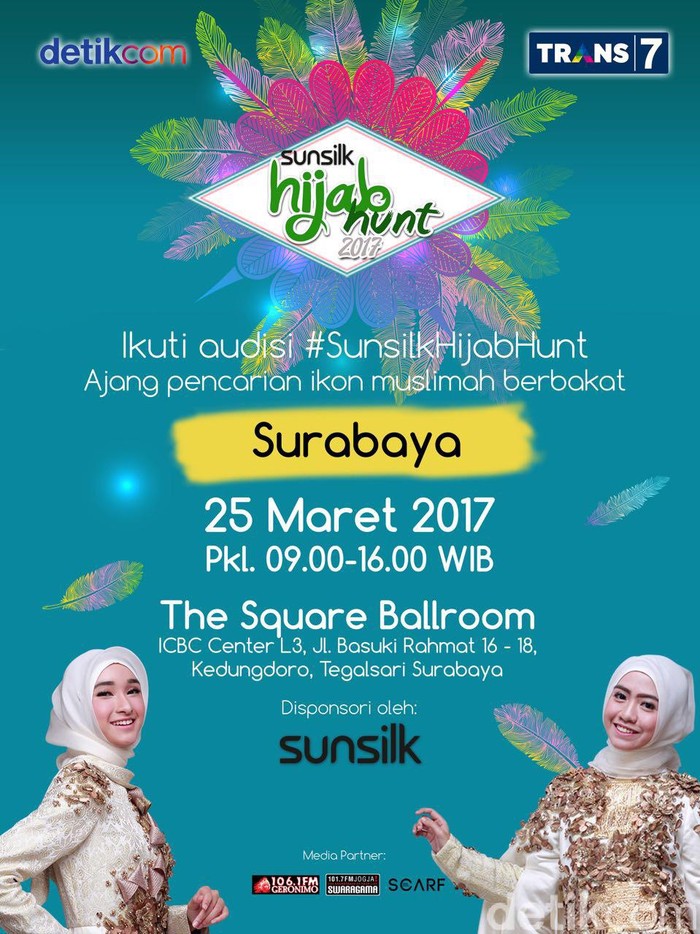 Memanggil semua hijabers berbakat di Surabaya dan sekitarnya... Ajang pencarian bakat hijabers Sunsilk Hijab Hunt 2017 hadir di Surabaya. Audisi hari pertama digelar hari ini, Sabtu (25/3/2017), di The Square Ballroom, ICBC Center L3, Jl. Basuki Rahmat, Kedungdoro, Tegalsari, Surabaya, Jawa Timur.