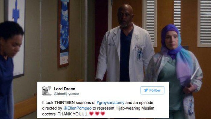 "I'm loving all the female doctors in hijabs in the backgrounds of all these scenes on greys," komentar pengguna Twitter bernama Keishy Omalley.