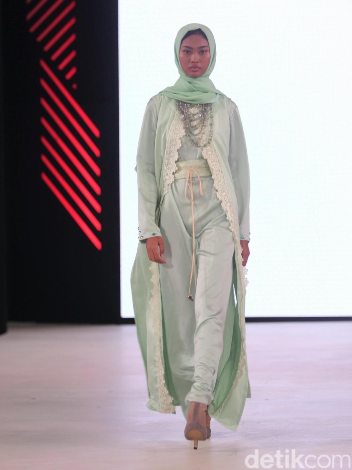 Baju muslim panjang dari model gamis, kaftan dan pasangan tunik juga celana pipa adalah bagian dari set koleksi Anniesa di gelaran Fashion Nation XI Senayan City, Jakarta Selatan, di hari keduanya, Jumat (7/42017). Warnanya juga dikemas lembut memakai palet pastel, misalnya hijau, abu-abu dan pink, juga coklat dan kuning mustard.
