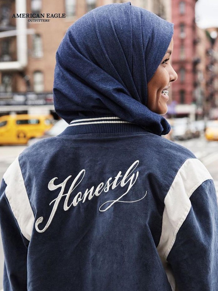Tak hanya menampilkan model berhijab, rupanya American Eagle juga mengeluarkan koleksi kerudung denim untuk hijabers. Kerudung denim polos yang dipakai Halima Aden dalam iklan terbarunya.