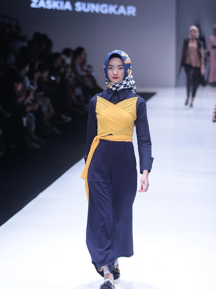 Hadir pula long dress biru navy yang dibalut kain berwarna kuning di area dada. Zaskia juga melansir pilihan outerwear dengan potongan asimetris yang terasa kekinian.