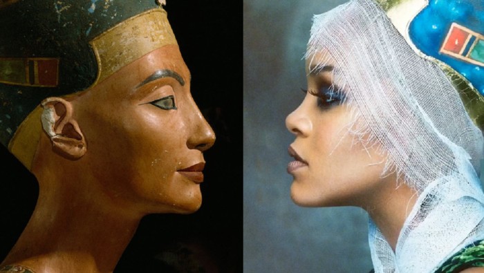 Rihanna akan berpose seperti Ratu Mesir, Nefertiti. Rihanna disandingkan dengan Nefertiti karena dianggap ikonik. Dalam cuplikan fotonya, tampak rambut penyanyi 29 tahun itu ditutup scarf tipis dan memakai topi seperti Nefertiti pada zaman dulu kala.
