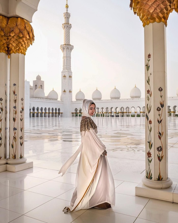 Momen itu diambil ketika sosialita cantik ini mengunjungi salah satu masjid besar di Abu Dhabi, Sheikh Zayed Grand Mosque. Jamie Chua memilih menggunakan kerudung panjang menutup rambut panjangnya. Ia bahkan memakai kaftan yang longgar dan menutupi lekuk tubuh.