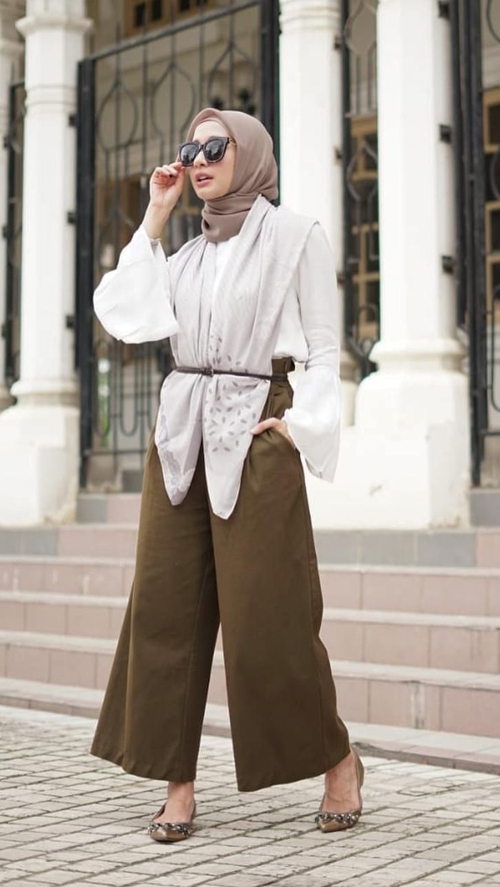 Baru-baru ini Laudya Cynthia Bella tampil memakai scarf motif dengan cara yang berbeda. Ia memakai hijab tersebut sebagai outer seperti vest, lalu menguncinya dengan belt di pinggang.