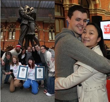 Awalnya ada enam pasangan yang mengikuti aksi memecahkan rekor dunia tersebut yang digelar berbarengan dengan National Hugging Day di Inggris. Enam pasangan itu melakukan aksi tersebut di stasiun kereta St. Pancras International, London. Mereka semua berpelukan tepat di bawah patung 'The Meeting Place'. Patung tersebut berbentuk pasangan yang tengah saling berpelukan dan berciuman.