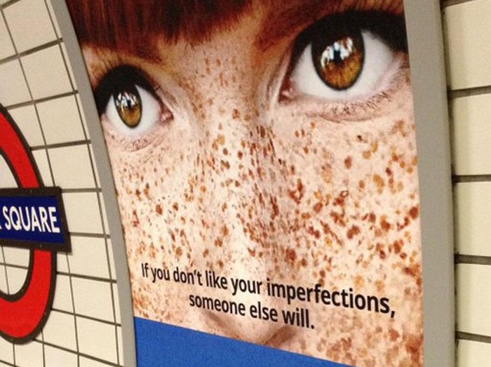 Iklan memperlihatkan foto close-up wanita berambut merah dengan wajah penuh bintik-bintik merah kecokelatan. Pada caption foto tertulis kalimat: "If you don't love your imperfections, someone else will."