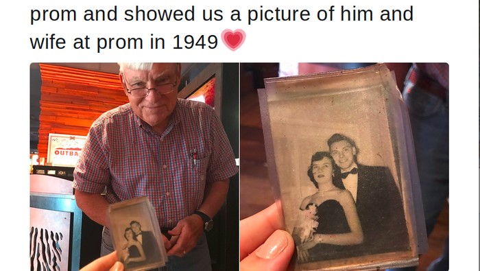 Bagi sebagian orang, prom mungkin hanya sebuah acara untuk merayakan masa SMA. Namun untuk seorang pria tua, acara tersebut sangatlah berharga. Ketika melihat sepasang anak SMA pulang dari prom, pria itu menunjukkan fotonya bersama sang istri di acara serupa pada 1949. Foto tersebut pun selalu dibawa dalam dompet. Manisnya kisah cinta viral menyentuh ini .