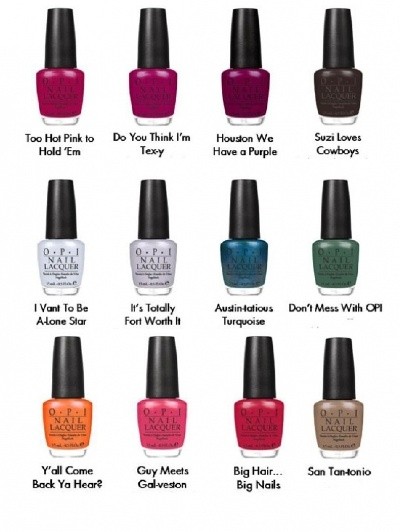 Setelah negara Rusia dan Spanyol menginspirasi OPI dalam cat kuku, kini keindahan Texas memberikan ide dalam warna-warna cat kuku. Warna alam Texas yang ceria dan eksotis tersalurkan dalam warna-warna cat kuku.
