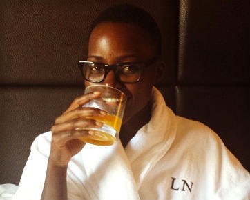 Dalam foto itu, Lupita mengenakan kacamata sambil memegang gelas. Saat itu, wanita 31 tahun itu berpose menggunakan jubah mandi dengan monogram (lukisan huruf) di bajunya bertuliskan inisial namanya.