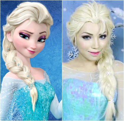 Setelah wajah dipulaskan dengan foundation dan bedak, bubuhkan eyeshadow ungu di seluruh kelopak mata. Tambahkan bulu mata bagian atas dan bawah agar mata semakin berbinar. Lalu pulaskan lipstik pink-fuschia dan terakhir baurkan blush on pink agar rona wajah tampak di pipi. Sentuhan terakhir adalah mengepang rambut dengan gaya menyamping. Akan lebih baik jika Anda menggunakan wig panjang warna pirang agar penampilannya benar-benar mirip Elsa.