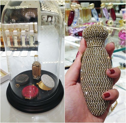 Ada pula botol parfum bertabur ratusan kristal yang sangat berkilau. Botol parfum tersebut seharga Rp 10 juta. Selain itu, beragam sovenir mewah juga dijual seperti kaca rias dan clutch yang 'dibungkus' dengan kristal serta piring-piring yang diukir dengan tinta emas sebagai pajangan di rumah.