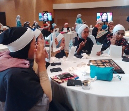 Masuk ke sesi kelas make-up, para peserta dilatih untuk memilih alas bedak yang satu warna lebih gelap dari wajah. Lalu diaplikasikan per bagian wajah dengan cara memutar. Untuk pemakaian bedak, disarankan untuk menggunakan kuas dan memilih warna yang satu tingkat lebih terang dari wajah. Jika ingin memakai sponge, Ika menganjurkan untuk melakukannya dengan ditepuk bukan diusapkan agar pelembap dan foundation tidak terangkat sehingga bedak bisa lebih awet.