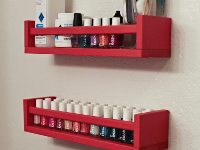 Hobi mengoleksi cat kuku namun tidak ada tempat lagi untuk menyimpannya? Gunakan rak yang terbuat dari kayu dan 'tempel' di dinding untuk meletakkan seluruh cat kuku Anda. Rak gantung ini bisa juga berfungsi sebagai pemanis dekorasi ruangan.