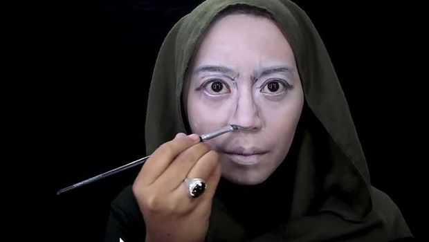 "Aku nggak pakai warna lain hanya warna hitam saja yang aku blend. Jadi istilahnya ini saya melukis wajahnya orang di wajahku sendiri," jelasnya lagi.