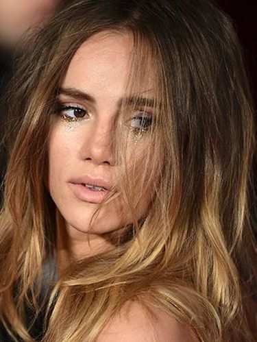 Penampilan mantan kekasih Bradley Cooper malam itu memang hanya fokus di bagian matanya, makeup keseluruhannya dibuat minimalis dengan pulasan eyeshadow coklat muda dan lipstik nude. Bubuhan glitter di bawah mata Suki semakin memperkuat karakter wajahnya yang melankolis.
