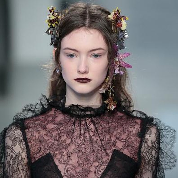 Rodarte menampilkan tema riasan yang menarik. Lipstik warna plum gelap diterapkan kepada para model sehingga menampilkan kesan gothic. Agar tak berlebihan, bagian pipi diberi highlight namun tanpa kontur dan blush on. Ditambahkan pula aksesori bunga pada rambut sehingga mempermanis tampilan. (ami/ami)