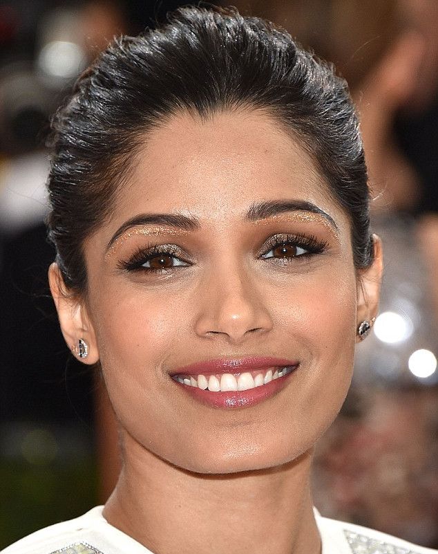Glitter banyak diterapkan sejumlah selebriti termasuk Freida Pinto. Pemain Slumdog Millionaire tersebut terlihat mengaplikasikannya secara unik yakni di bawah alis. Aksen itu pun berhasil menonjol mata cokelat Frida yang cantik. Berani coba di keseharian?