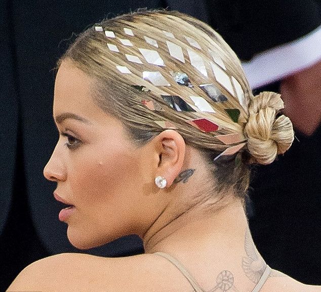 Berbeda lagi dengan Rita Ora. Selain dengan busana Vera Wang yang dikenakannya, kesan futuristic juga dihadirkan melalui riasan rambut. Gaya rambut Rita yang dibuat knotted chignon dilengkapi dengan serpihan metalik serupa kaca. Tatanan itu pun dibuat oleh hairstylist Brent Lawler.