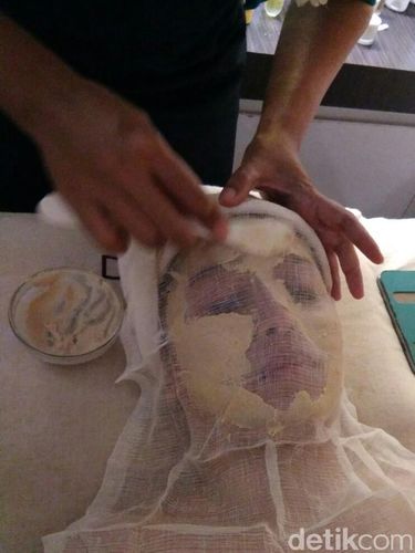 Tahap terakhir adalah masker. Agar masker tidak berantakan di wajah, terapis menaruh kain kasa di atas wajah, baru masker dipulaskan. Sebelum wajah kembali dibersihkan, masker didiamkan sekitar 10 menit.