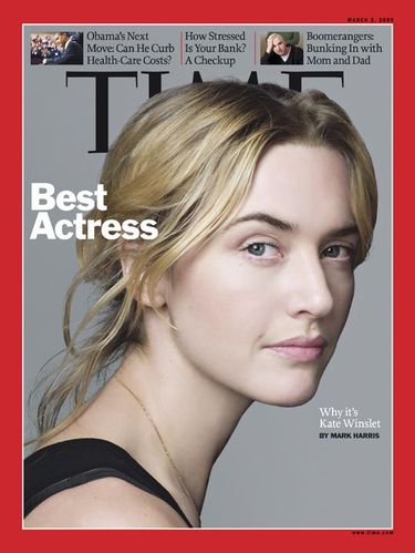 Menyabet gelar aktris terbaik Oscar 2009, Kate menunjukkan tampang aslinya di sampul majalah Time. Penampilannya secara keseluruhan terlihat sederhana. Rambut pirangnya diikat simpel dan tidak ada busana yang mencolok hanya tank-top hitam.