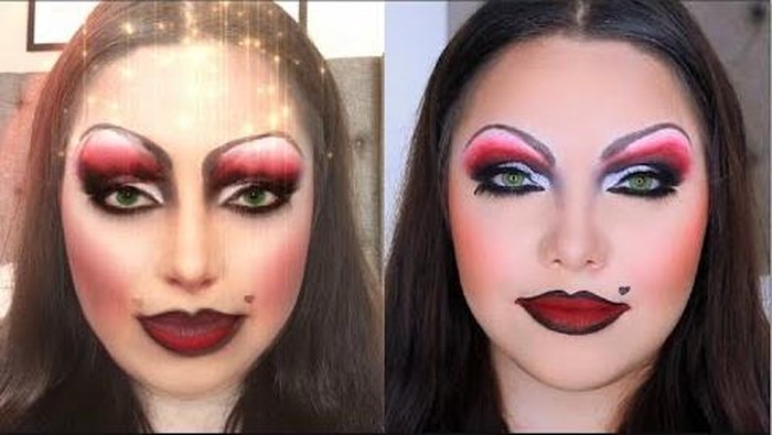 Vlogger kecantikan asal California, Mayra Isabel tampil dramatis dengan dandanan ala drag queen yang sempat menjadi salah satu filter Snapchat. Dengan menggunakan eyeshadow merah dan hitam serta bulu mata palsu yang panjang, ia membuat eyeshadow smokey eyes. Alis pun dibua lebih tinggi serta penambahan blush on dan contour yang sangat intens.