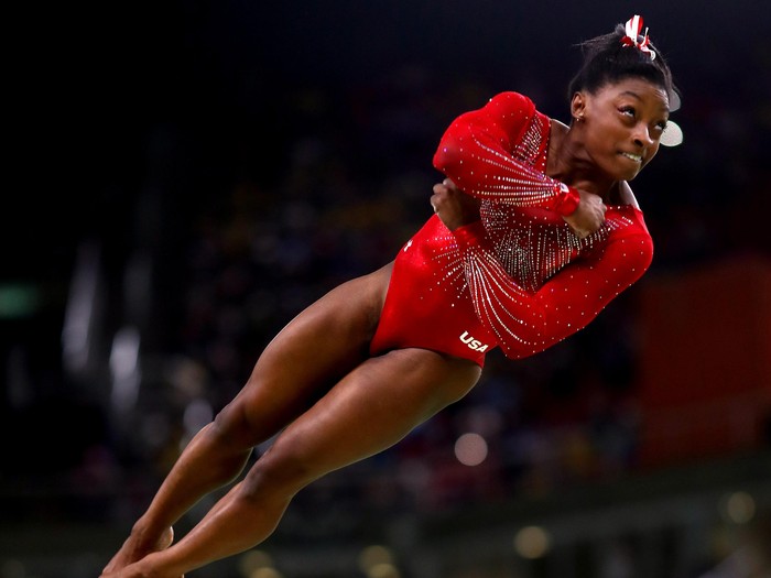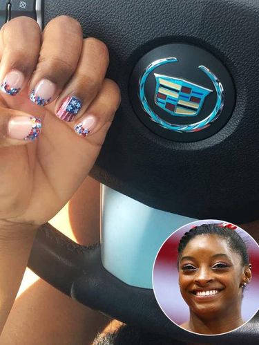 Atlet senam indah Simone Biles menampilkan kuku glamour berhiaskan glitter dengan gambar bendera Amerika di jari manisnya. Dengan kuku yang cantik, peraih medali emas itu semakin percaya diri memamerkan keahlian senam indahnya di Olimpiade Rio 2016.