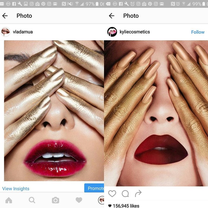 Gambar yang diklaim ditiru adalah sebuah foto yang memperlihat seorang wanita menutup matanya dengan jari. Jari wanita tersebut tampak keemasan sedangkan bibirnya dihiasi lipstik warna merah dengan tampilan ombre. Foto yang diambil oleh fotografer Julia Kuzmenko tersebut diunggah di Instagram Vlada pada September lalu. Beberapa waktu kemudian, akun Kylie Cosmetics pun mengungah foto serupa.