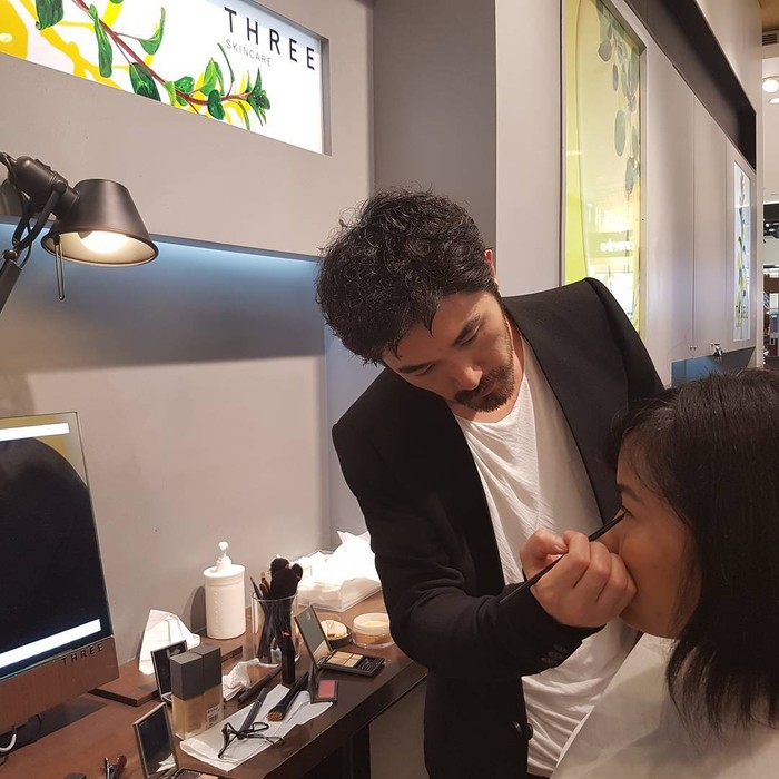"Kemudian untuk bagian tengah (hidung) arahkan (kuas) ke atas supaya fokus terlihat pada bagian hidung," kata Yuta ketika demonstrasi makeup di peluncuran produk Three di Premium Louge Cental Department Store, Grand Indonesia, Jakarta Pusat, Rabu, (22/2/2017).