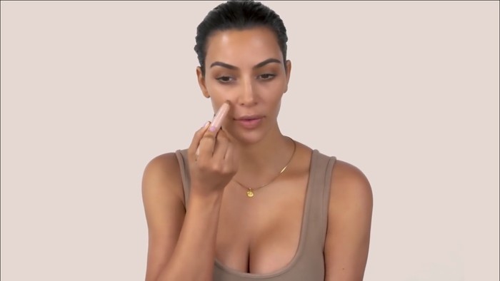 Kim yang tidak pakai foundation atau concealer tersebut kemudian menjelaskan cara merias simpel dengan waktu kurang dari lima menit untuk tampilan sehari-hari itu. Pertama ia menggunakan produk dual-sided highlighter stick sebagai concealer di bawah mata dan di tenga dahi. Kemudian ia menerapkan produk contouring di kedua sisi dan tengah hidung.