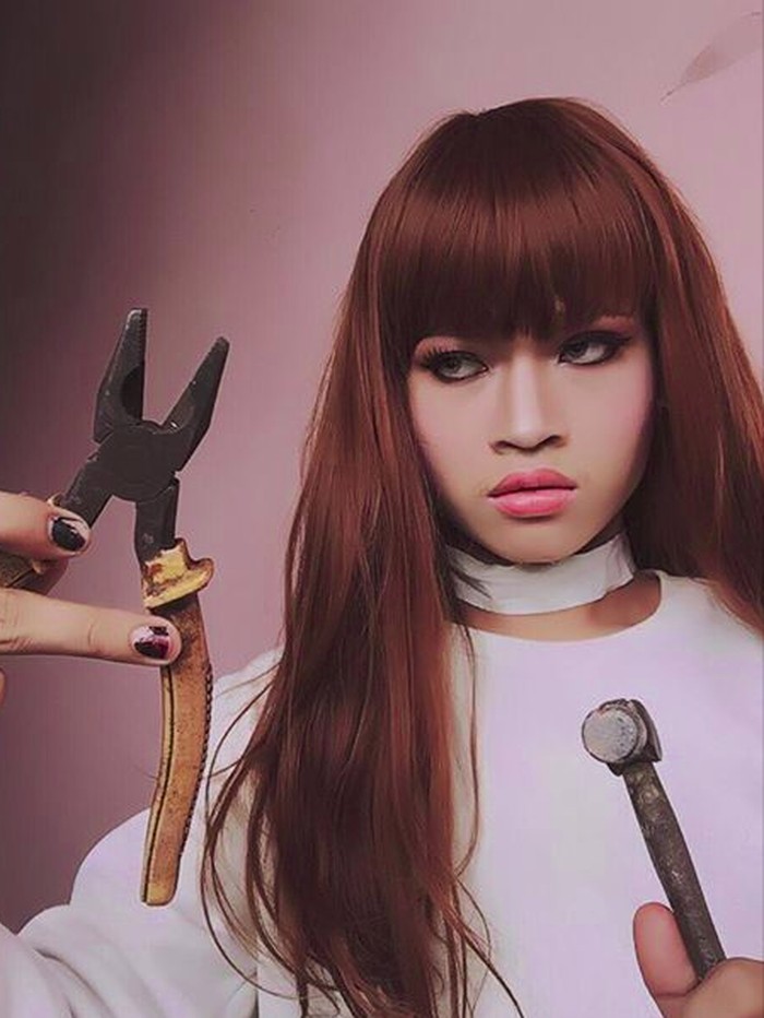Nay Sann juga menggunakan tang dan palu dalam penerapan makeup. Palu untuk mengaplikasikan foundation dan tang dimanfaatkan sebagai alat pemasang bulu mata. Kocak!