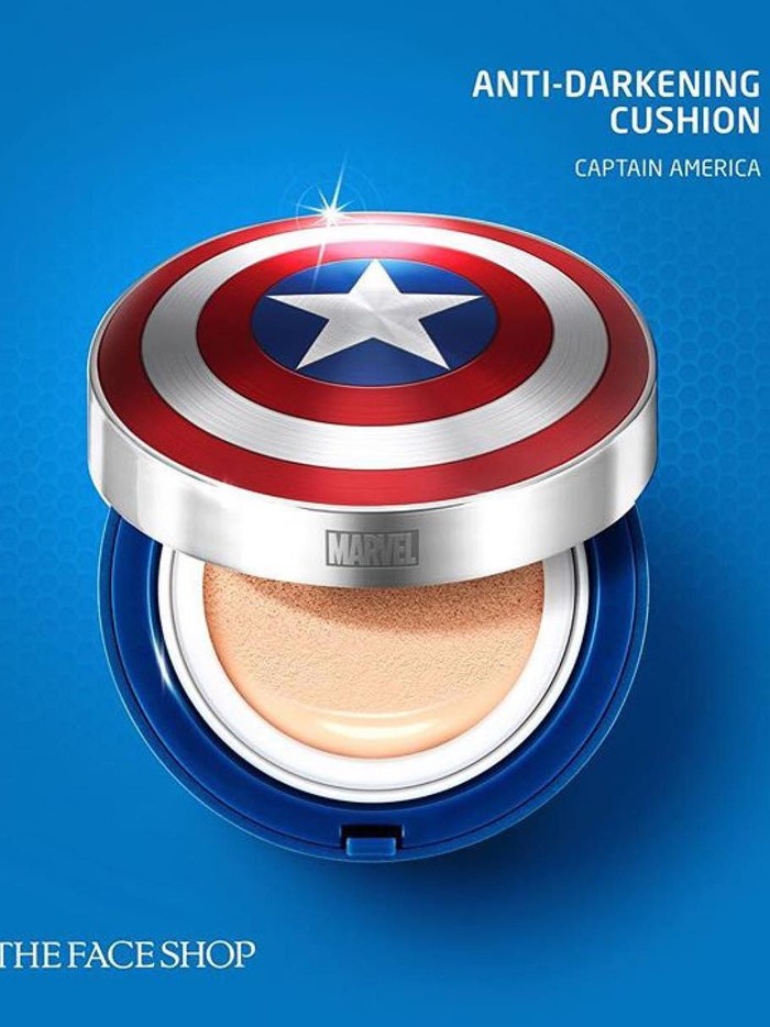 Koleksi yang terdiri dari lipstik, eyeshadow hingga maskara itu dikemas dalam wadah bergambar karakter-karakter Marvel. Dari postingan di akun Instagram resmi The Face Shop, terlihat karakter Captain America yang mendominasi koleksi tersebut.