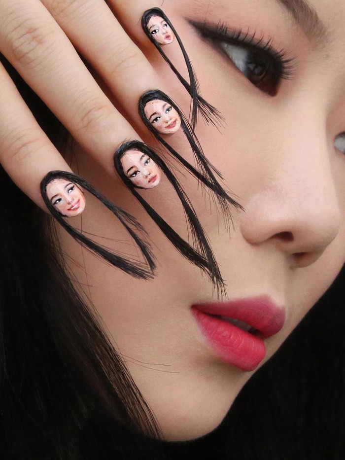 Nail art sampai pada tahap yang tak dibayangkan sebelumnya. Lebih dari kuku berhias swarovski atau bulu-bulu, seniman Dain Yoon menciptakan nail art dengan gambar wajah lengkap dengan rambut.