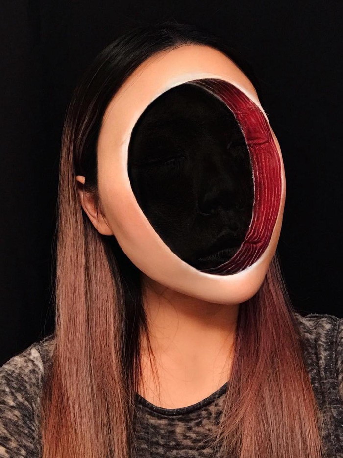 Makeup artist bernama Mimi Choi membuat tampilan makeup yang menyeramkan. Wajahnya dibuat gelap di bagian tengah, sehingga menciptakan ilusi tak punya wajah karena bagian tengah wajah yang bolong.