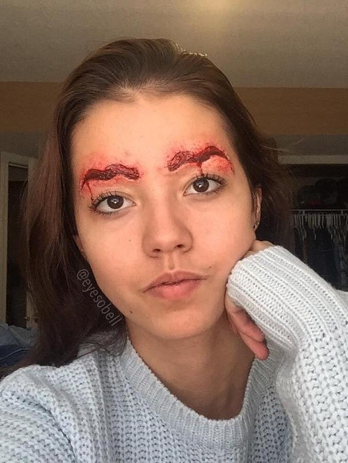 Tenang dulu karena alis gelombang berdarahnya itu bukan hasil dari goresan pisau melainkan dari efek makeup. Makeup artist bernama Isobele dengan akun Instagram @eyesobell memamerkan kreativitas makeupnya yang aneh.