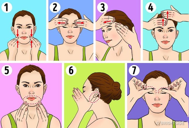Kemudian tarik pelan-pelan bagian dahi dengan satu tangan dan tangan lainnya menahan bagian samping. Selanjutnya tarik bagian dahi ke arah atas. Tekan area mulut secara melinggarkan menggunakan dua jari. Lalu dengan gerakan memutar, tekan bagian bawah telinga. Terakhir, tekan dengan hati-hati bagian bawah alis dan pijat bagian atas kelopak mata.