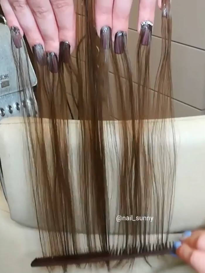 Kuku-kuku tersebut ditempeli dengan rambut extension. Uniknya, dalam video di Instagram @nail_sunny, rambut panjang yang telah ditempel di kuku diperlakukan layaknya rambut asli yang dicatok hingga di-curly.
