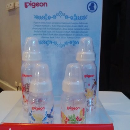Pengenalan batik sebagai warisan bangsa tampaknya semakin kencang digalakkan dari segala bidang. Misalnya saja dengan pengaplikasian motif dari teknik tekstil khas Jawa ini pada sejumlah benda non kain. Salah satu barang tak biasa yang diberi sentuhan tradisional dengan motif batik adalah botol bayi. Botol bayi pertama dengan motif batik ini diusung oleh brand perawatan ibu dan anak, Pigeon.