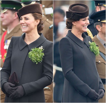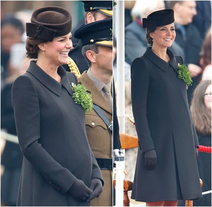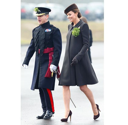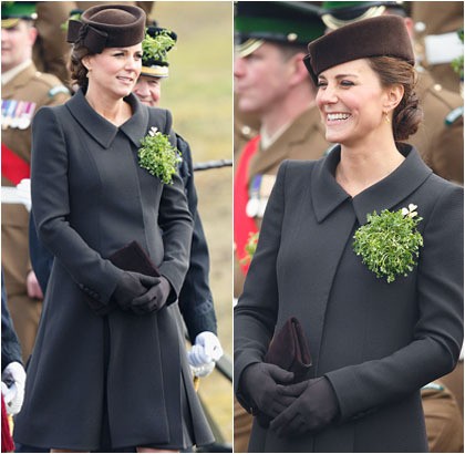 Kate mengenakan coat cokelat rancangan desainer Prancis yang bermukim di London, Catherine Walker, saat menghadiri perayaan St. Patrick's Day. Rambutnya dihiasi topi rancangan Lock & Co.