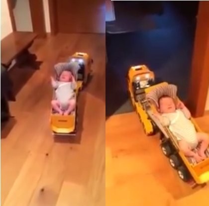Dalam video berdurasi kurang dari dua menit itu terlihat sang ayah menempatkan bayinya di atas sebuah truk mainan remote control. Sang bayi tampak tertidur lelap sementara truk tersebut bergerak keluar dan masuk ke dalam ruangan.